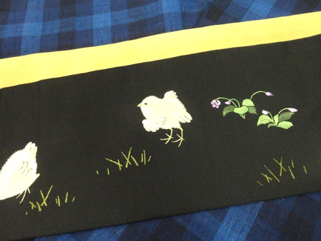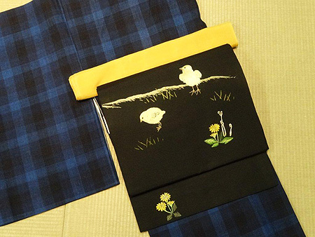 写真は黒地にひよこが蒲公英と蕨と戯れているかわいい刺繍を施した帯。