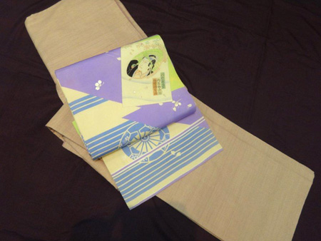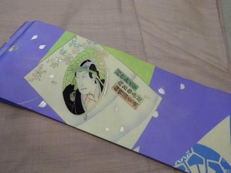 綾織無地紬に桜に役者図盃染名古屋帯桜舞い散る下、盃には、二枚目役者の面影。