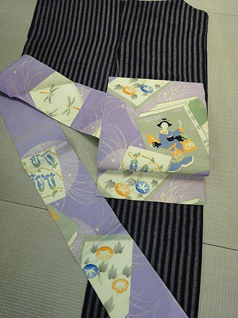 モダンな縞がくっきりとして粋な単衣着物に、柔らかい色目の名古屋帯を合わせました。