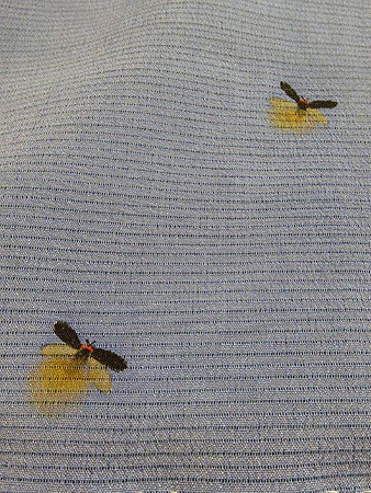 淡く美しい薄藍の夜に蛍が飛ぶ、とても珍しい図柄の三つ紋刺繍の単衣。