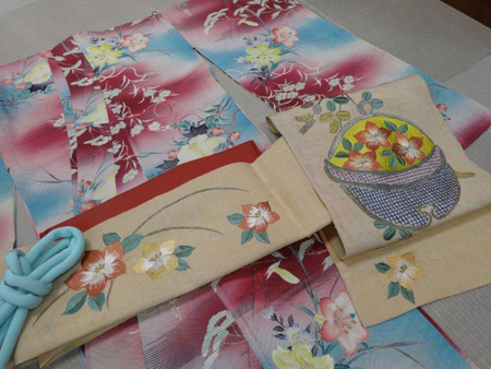 柄付けが小物ですが、上前の花に刺繍が施されお散歩着として仕立てられています。