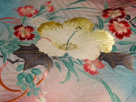 前帯の地とお太鼓の地の部分では違う染が施され、そのうえに糸をふんだんにつかった刺繍が刺されています。