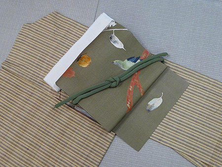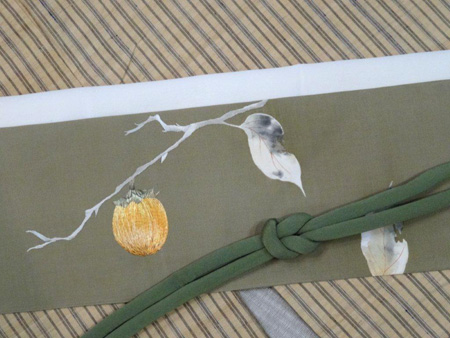 写真の帯は丁子色の塩瀬に、枝に実った柿を狙う鳥が刺繍された帯。