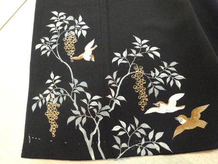 八掛も黒。江戸好みの雀と南天が可愛らしい染の縮緬となっています。