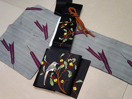 縞に矢羽根袷小紋と黒繻子に鳥と木の実の刺繍名古屋帯吹く風も、少し肌寒く感じるようになりました。