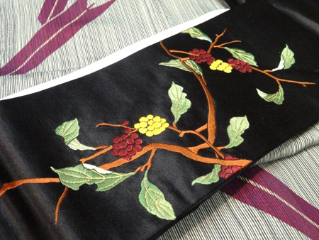 鮮やかな色で刺された刺繍が、黒地に映えて華やかな印象です。