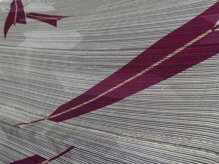 ご紹介の着物は、纏ってみてはじめて浮かび上がる矢羽根の地紋が織りこまれた布地に、型染めで縞を染めたうえにさらに矢羽根をが染めてある職人技が凝縮した小紋。
