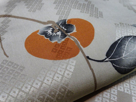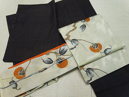 落ち着いた色目の紬に、鮮やかに柿の実が描かれた染帯で秋のコーディネートにしてみました。