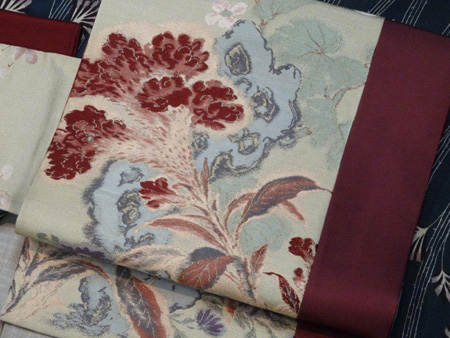 鶏頭の花が織り出された帯地に、別布を加えた灯屋2オリジナルです。
