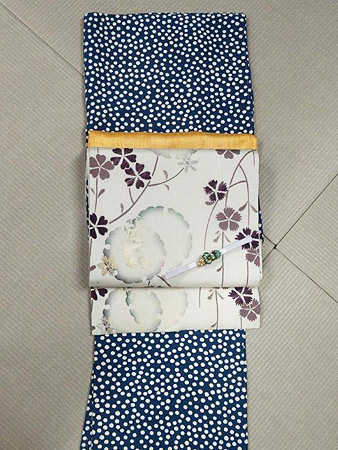 水玉小紋袷に雪輪に枝垂れ桜名古屋帯写真の着物は水玉がランダムに染められた小紋。
