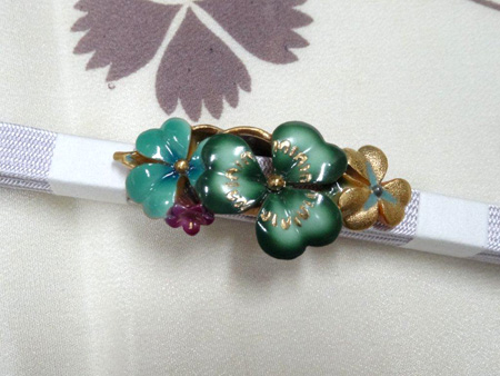 春を待つ想いでクローバーの帯留を合わせてみました。