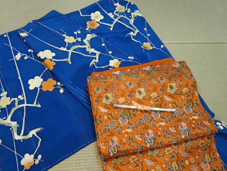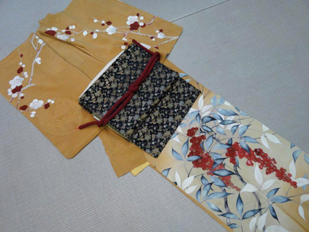 丸帯くずしの織帯が、寒の花々を引き立てます。