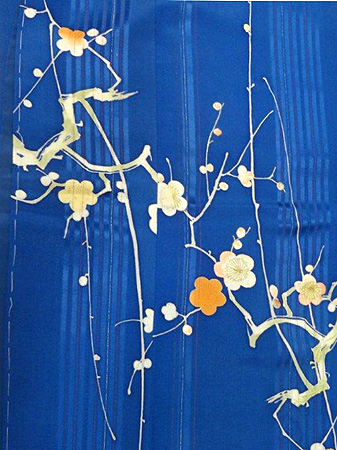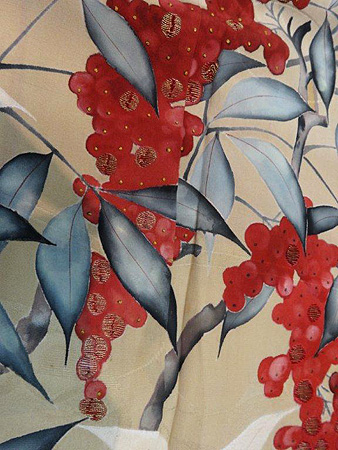 冬の晴れ着には、色を失う季節の中、花を咲かせ実を結ぶ生命力逞しい植物が描かれます。