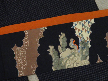 雲文に流水と鱗獅子の図名古屋帯小格子本場結城紬袷