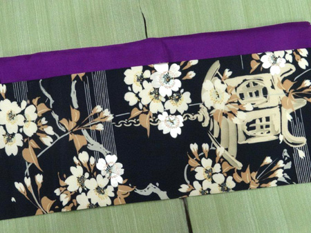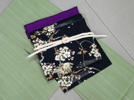 写真の桜の帯は黒地に風鎮と枝垂れ桜の染帯。夜桜のイメージでしょうか。