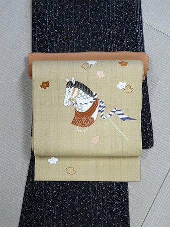 写真の帯は辛子地の紬に、春駒と可憐な梅を刺繍した帯。