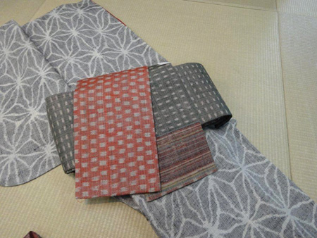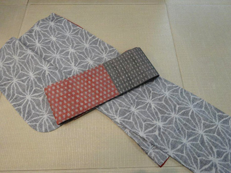 揺らぐ麻の葉 麻の葉は魔除けの模様。 様々なバリエーションで描かれている文様ですが… 浦野氏の麻の葉繋ぎは、静かな水面にうつしたような趣き。 モノトーンの色目に麻の葉が揺らいでいる様子は、一時代を先んじた浦野氏の、色褪せることのない前衛的な感性に触れるような気がします。 同じく絣の帯で、絣模様の面白さ、楽しさを堪能し尽くしたくなります。 麻の葉模様紬 172800円 身丈:4尺4寸(約167㎝) 裄:1尺7寸2分(約66㎝) 霰絣切継ぎ半巾帯 松田