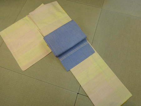 春色紅花紬に浦野藤鼠色経節紬名古屋帯こちらの紅花紬は、とても淡い黄色とピンクのスイートピーをあつめて花束にしたような、ほんわりと優しい色合い。
