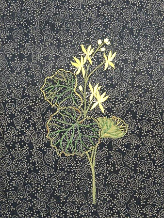 もう一点は、三ッ紋の縮緬明治江戸小紋に黄色の花が可憐な石蕗(つわぶき)の刺繍。