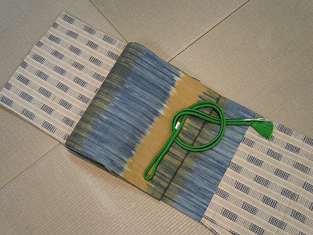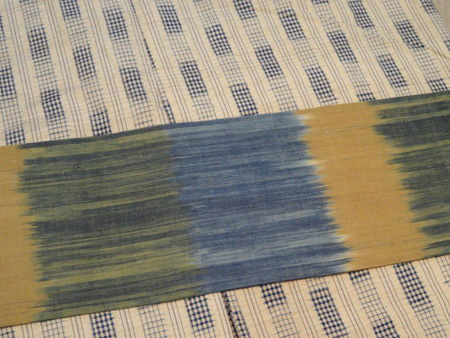 青と緑、辛子の混ざり合った縦絣が独特の雰囲気を醸し出しています。