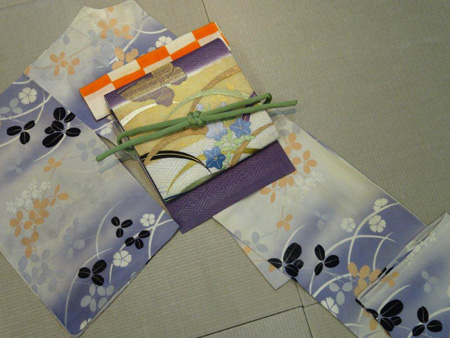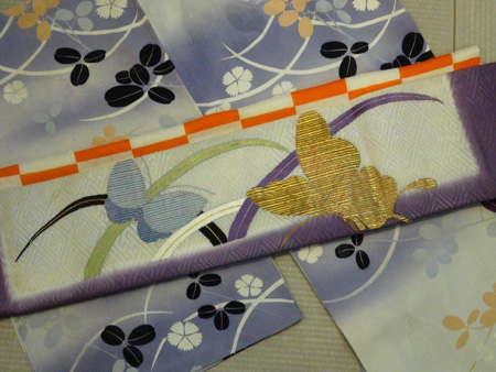 帯は紫、金、銀の横段暈しに桔梗と蝶が舞っている帯。