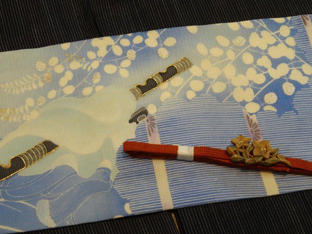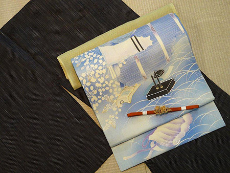 合わせた染帯は淡いブルーのぼかしに、萩と御簾の図が描かれた帯。