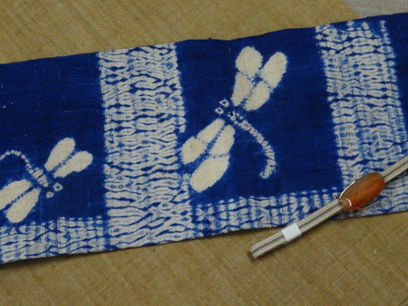 蜻蛉紺青色帯に瑪瑙帯留写真の帯は、紬地に蜻蛉と竹垣のような直線の絞りの柄。