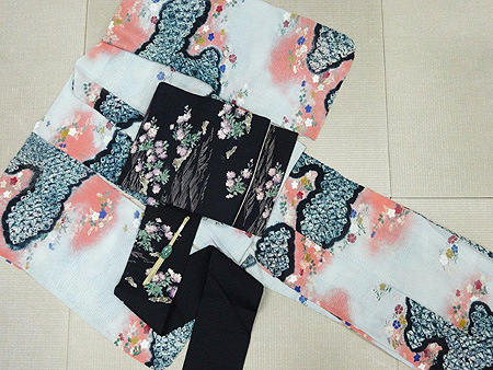 着物の魅力を引き立たせるように、帯は少々控えめに。
