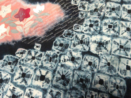 墨黒の雲取りの中に存在感のある蟹蜘蛛絞りが施された、存在感のある単衣小紋です。