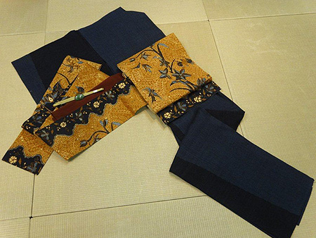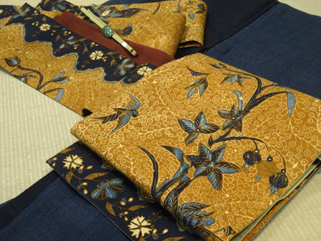 合わせたジャワ更紗は、ろうけつ染めで茶褐色と藍の二色だけで染められた柄。