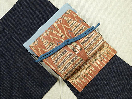 縞結城紬にインドネシア カリマンタンイカット帯縞結城紬