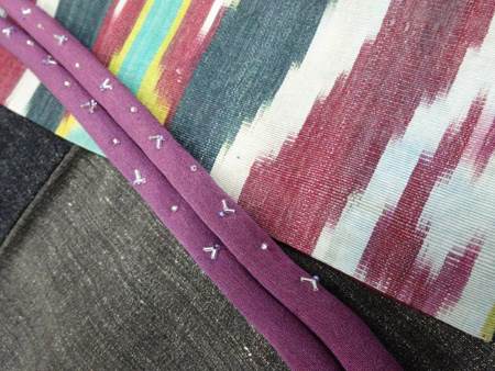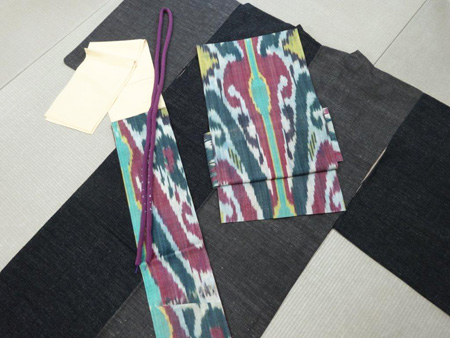 もうすぐ!!外国布展 その2 ウズベキスタンの布で、スザニとならんで大好評のアドラス! こちらはその中でも、特に貴重なアンティークのアドラス布で作った付け帯です。 シックな色合いが、なんともいえない雰囲気をかもしだします。 片身代わりの結城縮にぴったりの大人の装い。 ビーズの丸ぐけでエレガントにそうぞ。 ウズベキスタン・アンティークアドラス付帯 118,800円 結城縮片身代わり袷着物 172,000円 身丈:4尺2寸(約159.6cm) 裄:1尺8寸(約68.2cm) ビーズ丸ぐけ 8,400円 海老沢