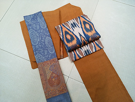 本場結城無地袷紬にアドラス名古屋帯柿色の本場結城にのせた外国布の帯は、中央アジア・ウズベキスタンのアドラス。