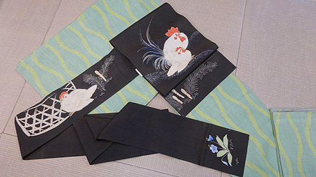 こちらは雌雄の鶏の表情が個性的な名古屋帯です。