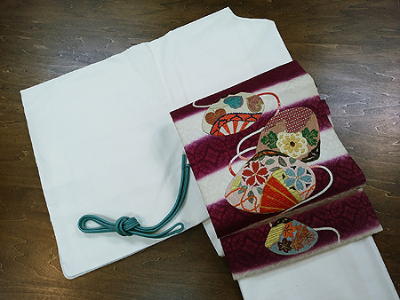 正倉院紋様が、地紋織りされた上に古代紫が、暈しで引き染めされた華やかな帯。