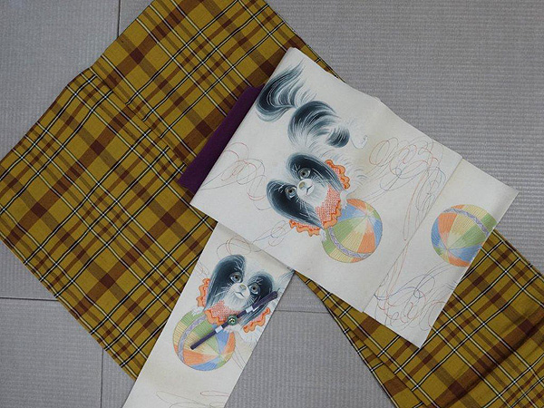 まずは、辛子と茶の格子の着物に狆(ちん)の帯のコーディネート。