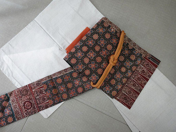 続いて、大人な表情の白大島とインド更紗のコーディネート。