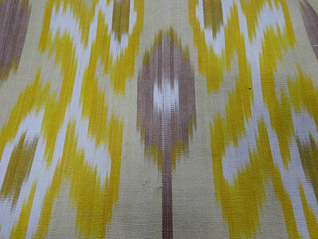 ウズベキスタン・アドラス羽織(イエロー)当店オリジナルのこの羽織は、表地がウズベキスタンのアドラス、裏はインドサリーの布で仕立て上がっています。