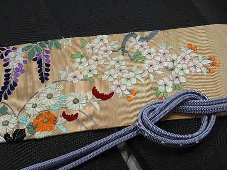 赤漆の糸とベージュの糸が交互に織りこまれた横縞の地に満開の桜、枝垂れ藤、可憐な菊が刺繍されています。