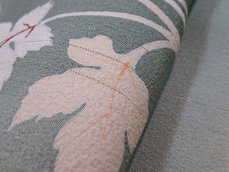 縮緬地の中に金通しになった生地に緑の暈しが霞のように染められ、可憐な春の山野草が描かれています。