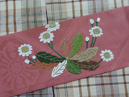 写真の帯は絽刺しとアップリケでたんぽぽを描いたもの。