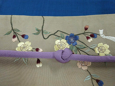 縹(はなだ)色本場結城単衣に桜の刺繍帯大きく膨らんだつぼみを真っすぐ空に向け、その時を待っている桜達。