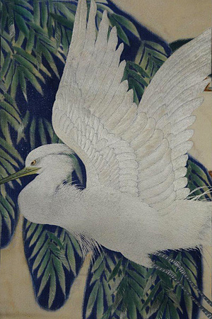 柳の葉の奥におりはじめた夕闇に、艶やかに光る羽根の白さが冴えています。