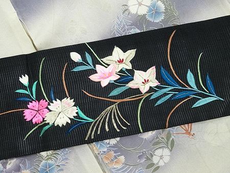 合わせた黒地の絽の帯は、お太鼓にも前にもたっぷりの刺繍を施しています。