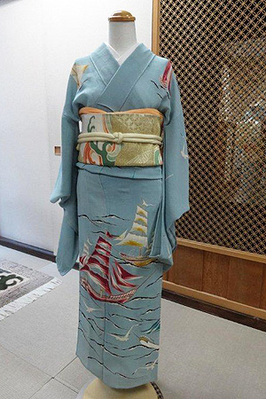 帆船とカモメ紗一つ紋訪問着に波頭に楓文様絽袋帯帆船とカモメ紗一つ紋訪問着帆船とカモメ紗一つ紋訪問着