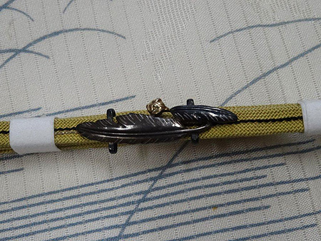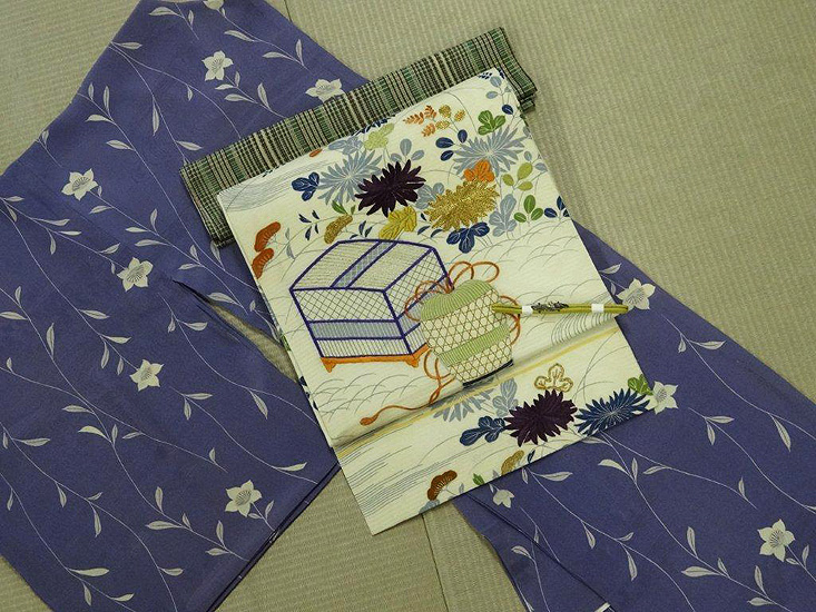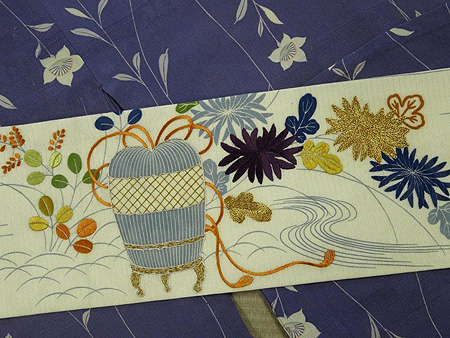 たっぷりの秋草花と虫籠の刺繍の帯と軽やかな羽根の帯留を合わせてみました。