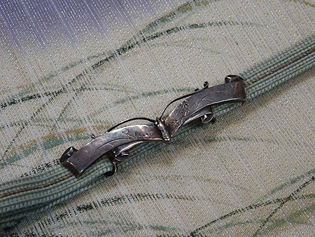 霞に芝模様開き名古屋帯に蝶の帯留