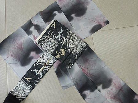 墨色ぼかしすすき単衣小紋に黒地葦に雁文様夏織名古屋帯