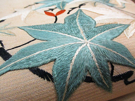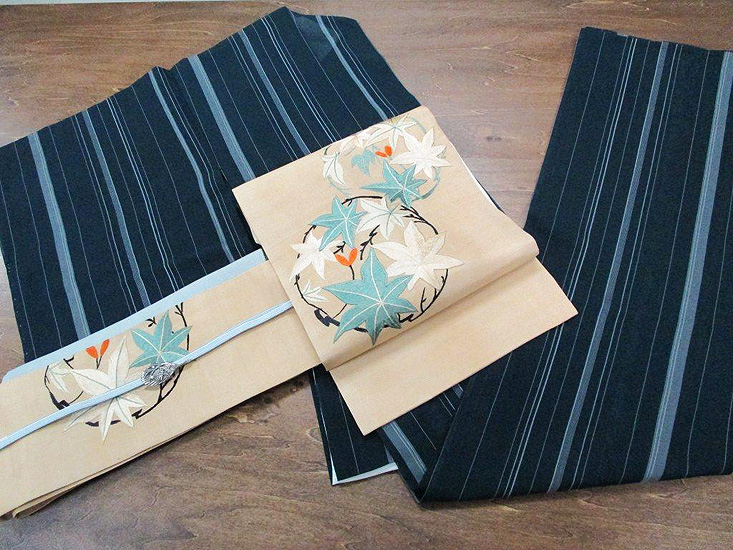 縞好き ちょっとお出かけという時に、普段の着物に帯だけ少しお洒落帯にして出掛ける事が良くあります。 ご紹介のきものは、紗の縞着物。 紗の透け感が涼しい着物です。 帯は、絽地に楓の丸紋刺繍。 たっぷりとした刺繍が豪華で、縞の普段着物をお洒落に演出します。 露芝にトンボのうちわの帯留で夏らしさそえて。 紗地縞着物 50000円+税 身丈:4尺(約152㎝) 裄:1尺7寸7分(約67.2㎝) 絽地楓丸紋刺繍夏帯 73000円+税 露芝にトンボ帯留(帯締め別) 徳永