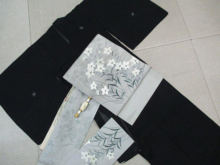 きりぎりすと蛍がさり気なく縫い取られた黒地の明石縮に、艶のある白い桔梗が美しい帯を合わせて。